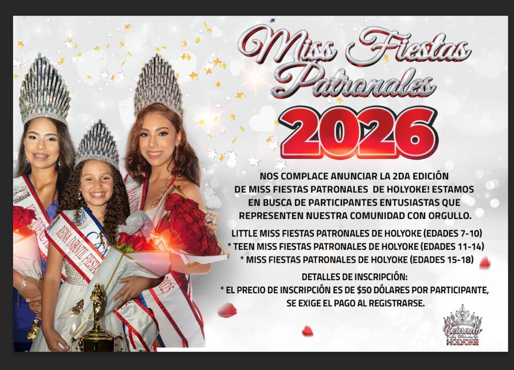 Fiestas Patronales of Holyoke is excited to continue the tradition of Miss Fiestas Patronales, which began in 2024 and is now returning for its third year in 2026! This event celebrates young individuals who embody pride, charisma, and leadership within our community.